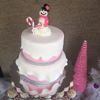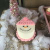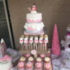 Wintery pink and white themed first birthday party cake, cupcakes, cake pops and all buttercream piped snowman smash cake