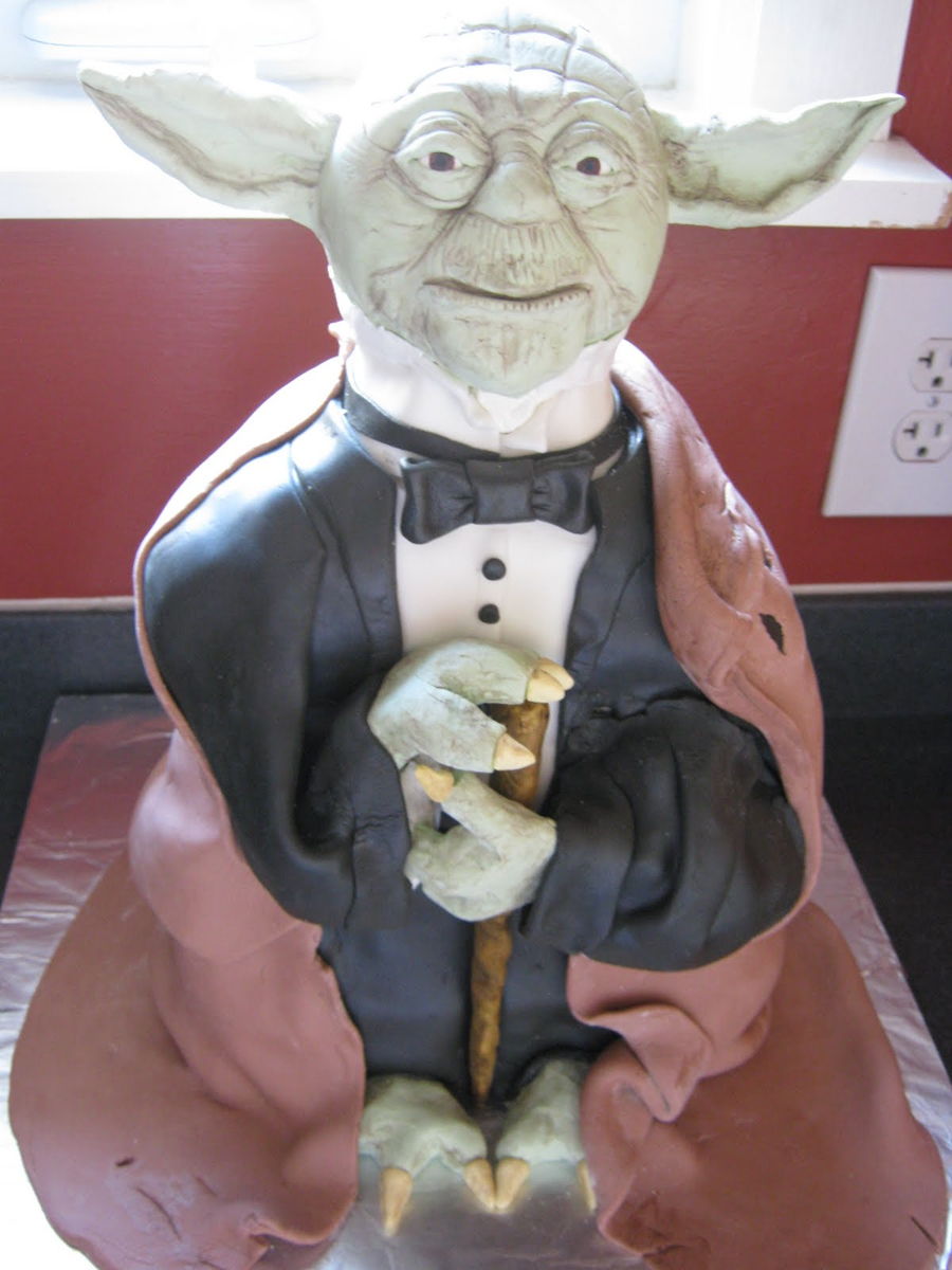 Customer wanted a groom's cake in the shape of Yoda dressed in a black tux.