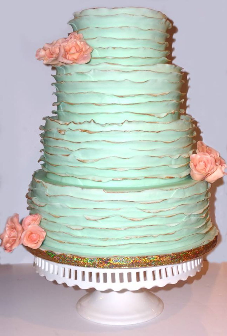 4 tiers, red velvet wedding cake with white ganache and mint green marshmallow fondant ruffles