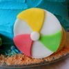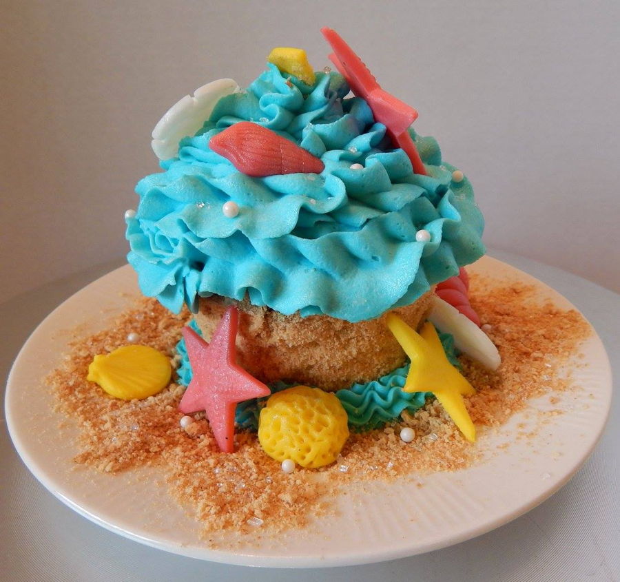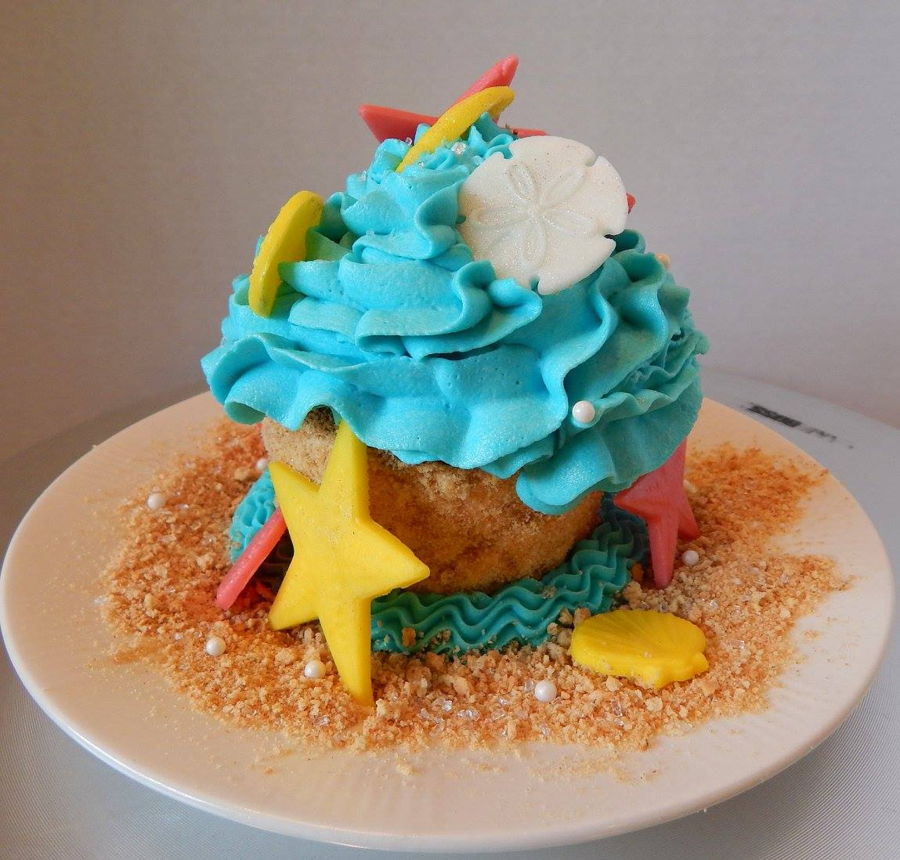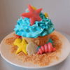Reese's beach themed first birthday cake, jumbo smash cupcake and beach ball cupcakes! The cake is an 8 inch cookies and cream cake, the cupcakes are dark chocolate fudge and confetti tinted blue like the ocean! Everything is edible, all buttercream and candy clay, no fondant!