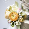 The cake was designed for the Modern Bride with elegant champagne pearled tiers and silver accent tiers. The tiers are decorated with Ranunculus, Roses, Sweet peas and Filler sugar flowers along with Royal icing detailing.