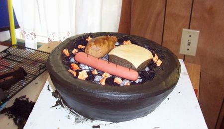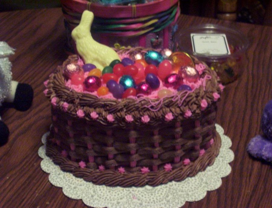 I tried 3 times to make a handle out of Fondant for this and each time it was moved by a different member of my family before it was dry, and it broke. I gave up on it after the third time. I was VERY happy with the cake though. Its chocolate cake with whipped buttercream frosting that I added cocoa powder to. It is very tasty with the chocolate.