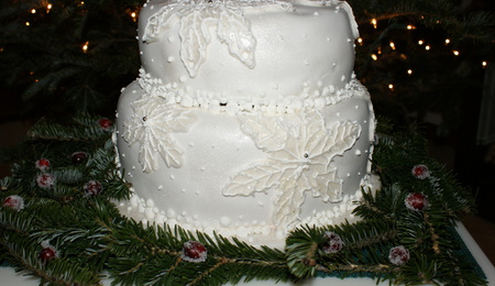 Fondant covered chocolate cake with SMBC and White cake with raspberry reduction and SMBC filling all covered in choc. ganache. I used Marvelous Molds for most of the decorations on the cake, they are great! The lace is Claire Bowman lace.