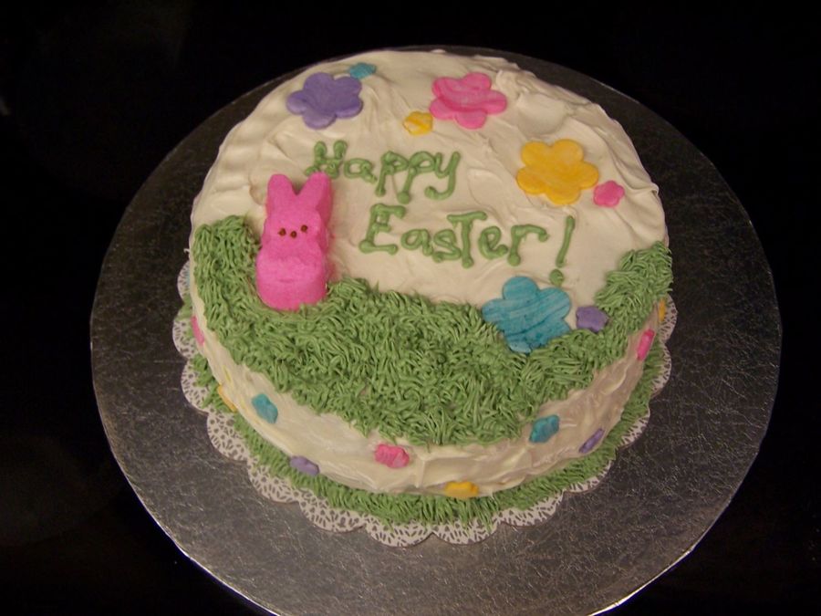 My son wanted me to use his ideas on this cake. Chocolate cake with vanilla frosting. "Grass" with bunny Peep, and MMF flower cut-outs.