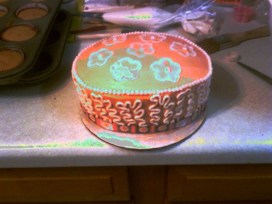 The quality of this photo is terrible!!! Sorry, I hope you all can still see it a little, :) This was my first attempt at cornilli lace and this shaped cake, It was done in all bc, nonedible ribbon at the botton, and brushd flowers. Tons of fun to make!