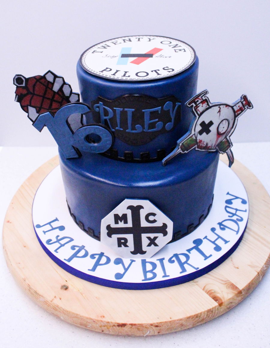2 tier fondant with icing sheet/wafer paper cutouts of her favorite bands (Blink 182, Twenty One Pilots, My Chemical Romance) and a "16".