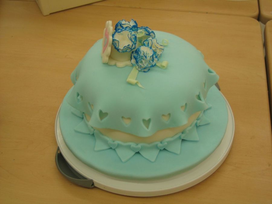 This is a white enhanced cake with butter cream frosting. On top of that is a layer of white fondant and then the blue fondant. The carnations are made out of gum paste and dusted blue. The box on top is made out of fondant. The heart border at the bottom is also made out of fondant.