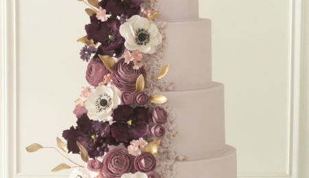 This cake was made with fondant and modeling chocolate to create tree bark textures. All the florals are made with gum paste and Flexique.