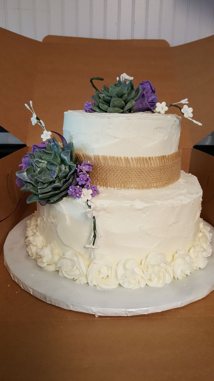 This is a buttercream cake with gum paste succulents and piped on rosette border. Also used burlap ribbon.