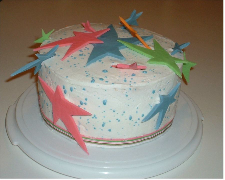 My 15 yr. old wanted a cake with ehr favorite design...STARS! The icing is buttercream, with watered down buttercream splattered on it. The stars are fondant. The base is designed with fabric ribbon.