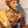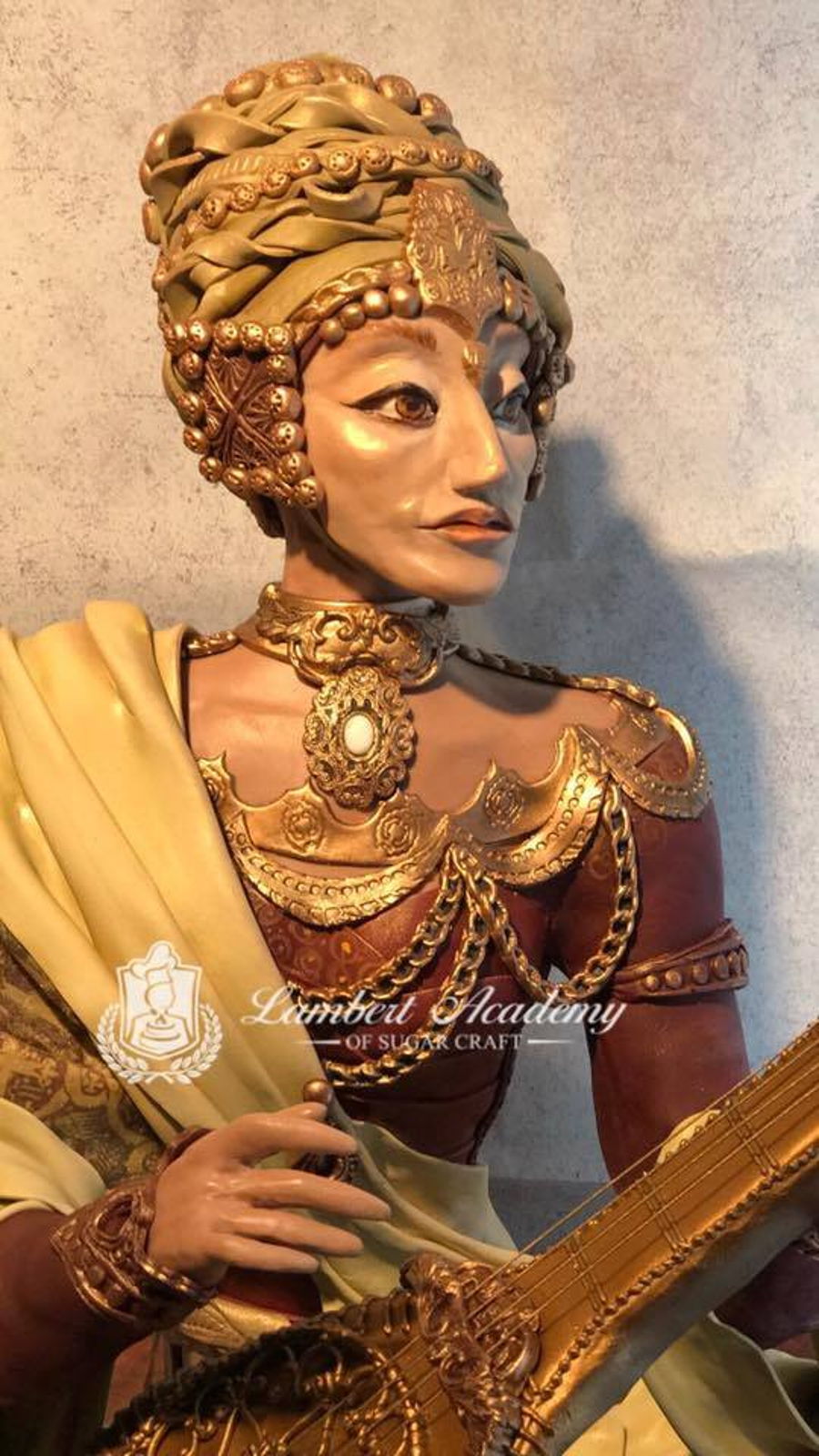 She is created from an internal structure of copper tubing and sculpted in modelling chocolate. Clothing is fondant, edible silk fabric, and modelling chocolate accents. The board is a technique recreating cork flooring using butchers paper, nontoxic glue, food color gels and confectioners glaze.