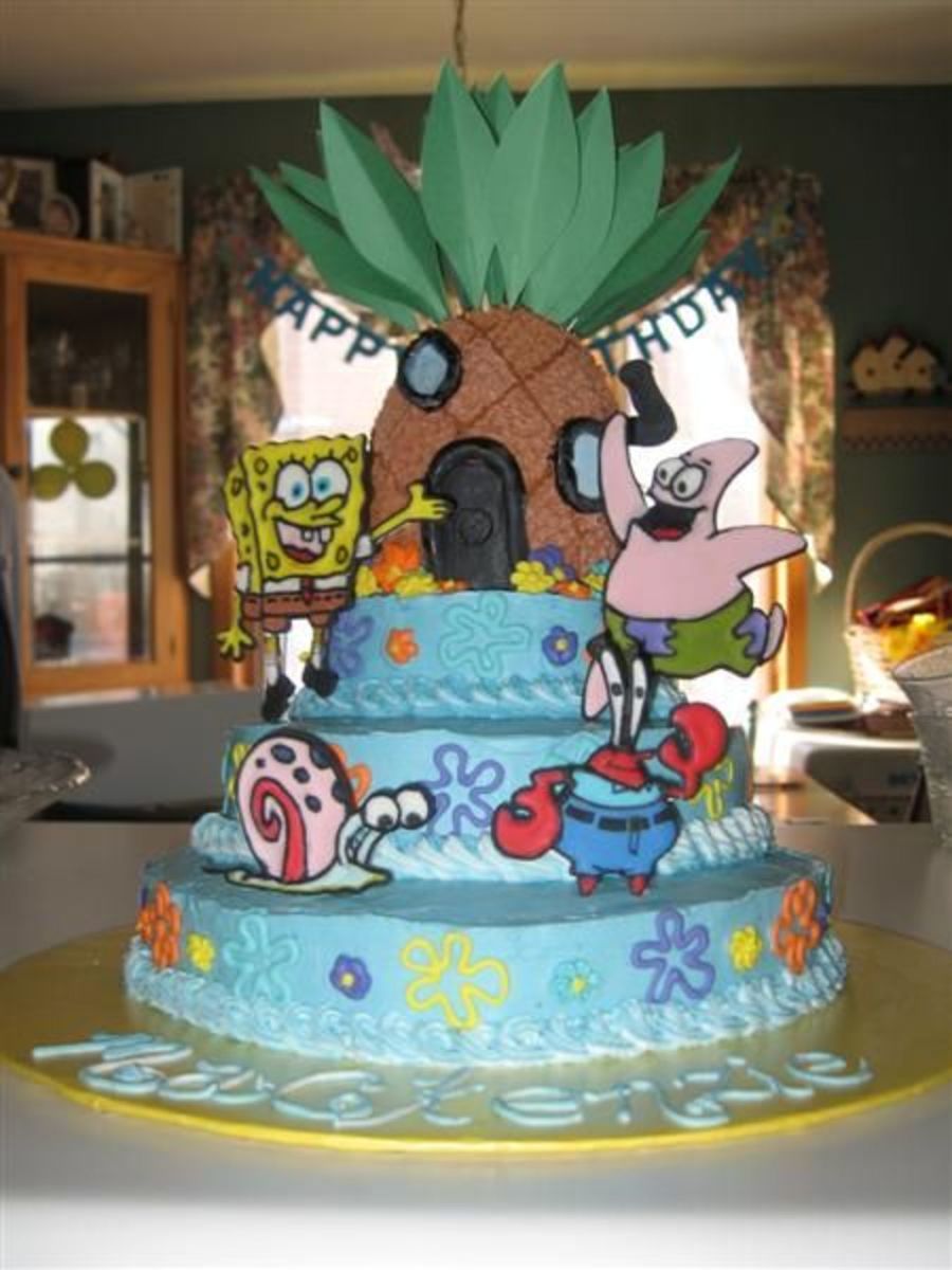 The second spongebob squarepants cake I made. A three tiered cake all lined up at the back of the cake. Next time I will dowel rod a cake like this because driving it was a real test of patience. Colorflow characters, royal icing flowers. The pineapple house was a styrofoam ostrich egg dummy with the bottom cut off and iced in royal icing. The leaves were construction paper attached with wires. I got the idea from a cake on this site but I am not sure whose cake it was.