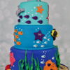 Birthday cake for my son. He said he wanted a shark cake for his birthday, so he helped design this! 6" and 8" vanilla cake with vanilla buttercream. Bottom tier is a dummy. All are covered and decorated with fondant. Graham cracker sand with some chocolate rocks.