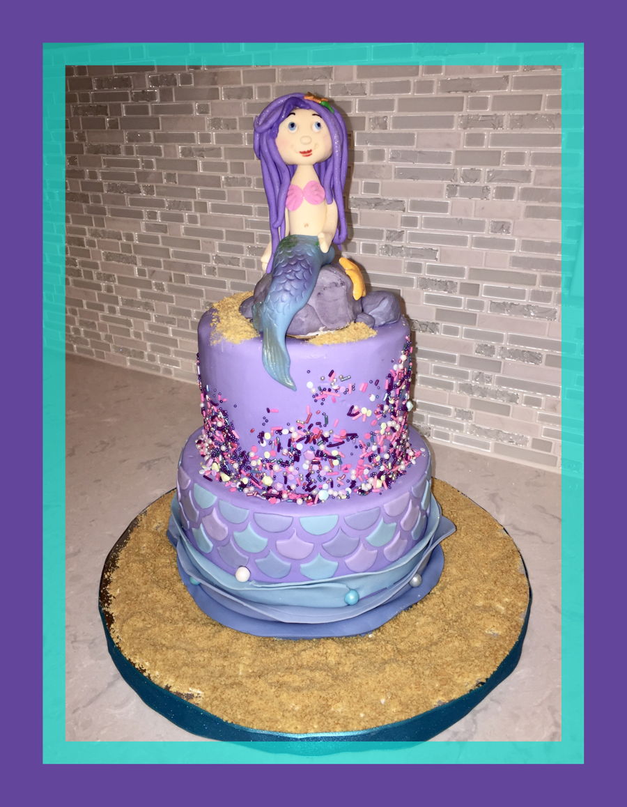 Mermaid atop a two tiered fondant covered cake. Sprinkle accents on top their and mermaid scales and coordinating waves and pearls on the bottom tier