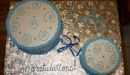 8" and 4" cakes iced in buttercream with fondant bow, numbers and polka dots