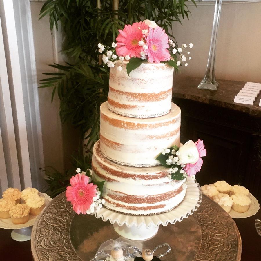 Rustic "naked" cakes with coordinating cupcakes.