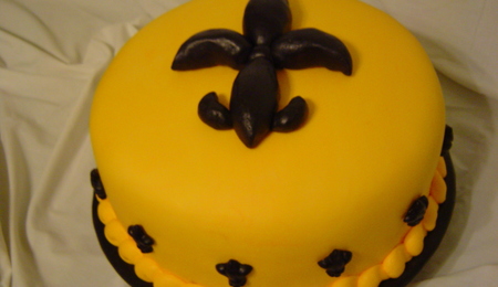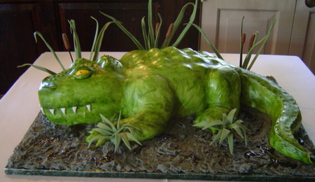 6", 12" stacked cakes roughly covered in buttercream icing to resemble water. Saltwater redfish tops the cake with a lure in its mouth. Surrounding the 2 cakes are oyster beds in which the fish feed. Fish is rice crispy treats covered in fondant/gum paste mixture. Oysters are pure fondant painted to resemble the saltwater delicacy.