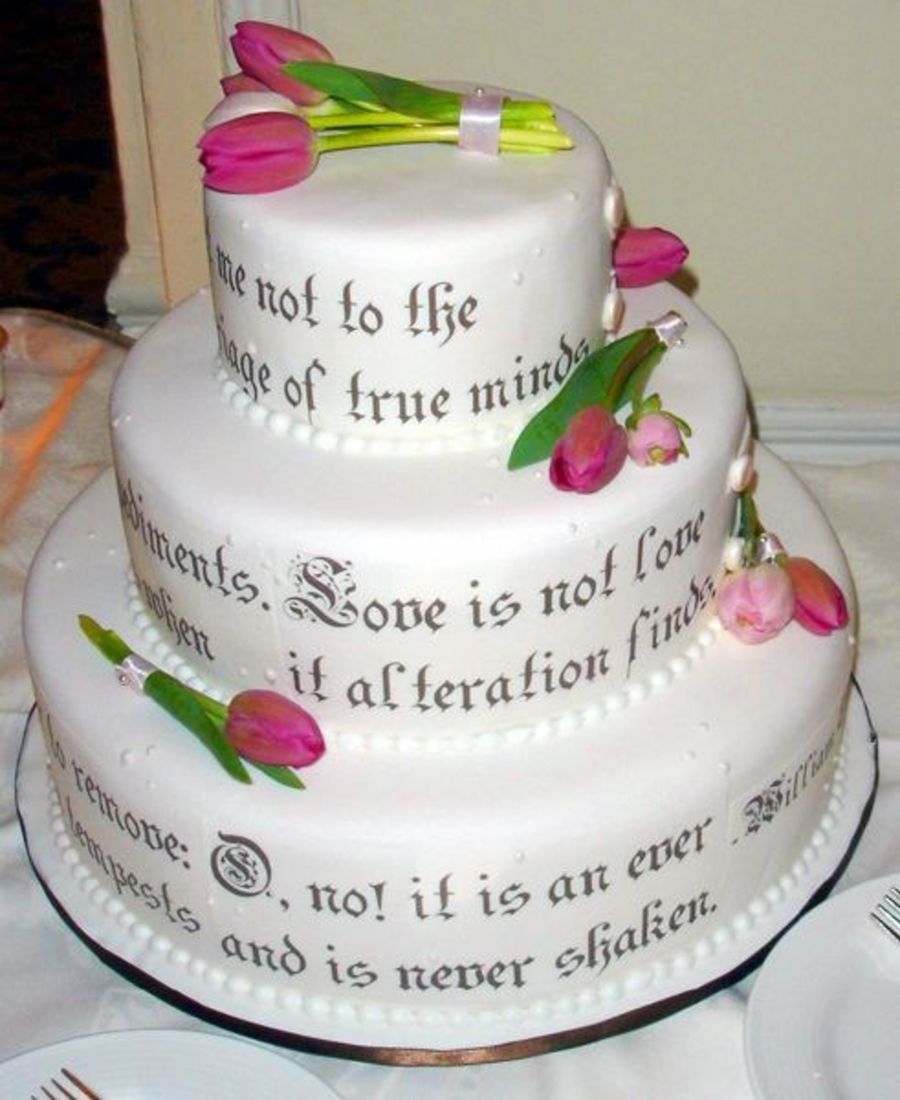 The front side of the cake includes Shakespear's Sonnet 116: Let me not to the marriage of true minds Admit impediments. Love is not love Which alters when it alteration finds, Or bends with the remover to remove: O no! it is an ever-fixed mark That looks on tempests and is never shaken;