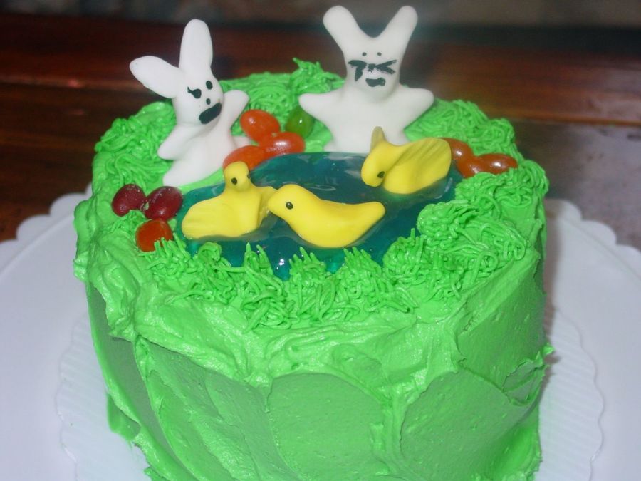 This Easter cake was made with buttercream icing for the icing and the grass. The bunnies and chicks were made with fondant and food coloring for the facial features and the water was made with piping gel tinted blue. The eggs are actually jelly beans.