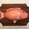 The fish is cake and buttercream covered in fondant with gumpaste fins. The board is covered in fondant texturized and painted to look like a wooden board.