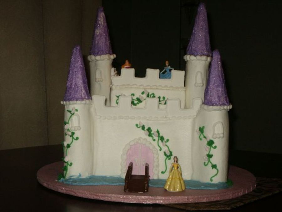 This was my first attempt at making a castle cake. The main castle is made from a double layer 10" sq. then a 6" sq to finish. the terrets are all paper towel roll. the cones are sugar cones covered in icing and dipped in sugar crystals. The crowns on the edger were cut from fondant about five days ahead. I was really pleased with this cake. It made me crazy nervouse though