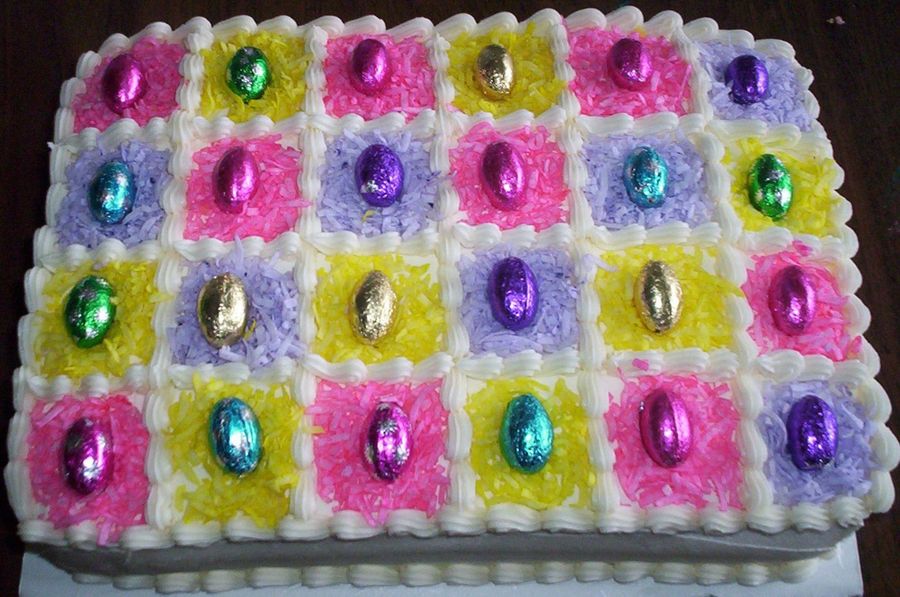 I waited a whole year to do this one because I always love this one. it is so easy to do and everyone always loves it. I made a white cake then divided the batter into 4 and made it yellow, pink, blue and purple. I filled the cake with the oreo cookies and cream filling and then iced in buttercream with colored coconut on top.