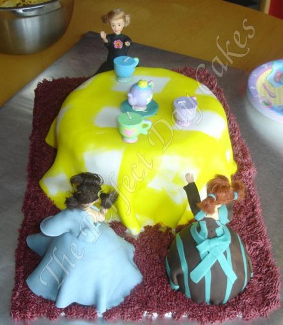 This was my daughters birthday cake. The teapot and cups are candles that matched the invitations, cups and plates. The table cloth matched the tablecloth on the invitations. The table was a vanilla caramel and the dolls, little girls were chocolate mint.