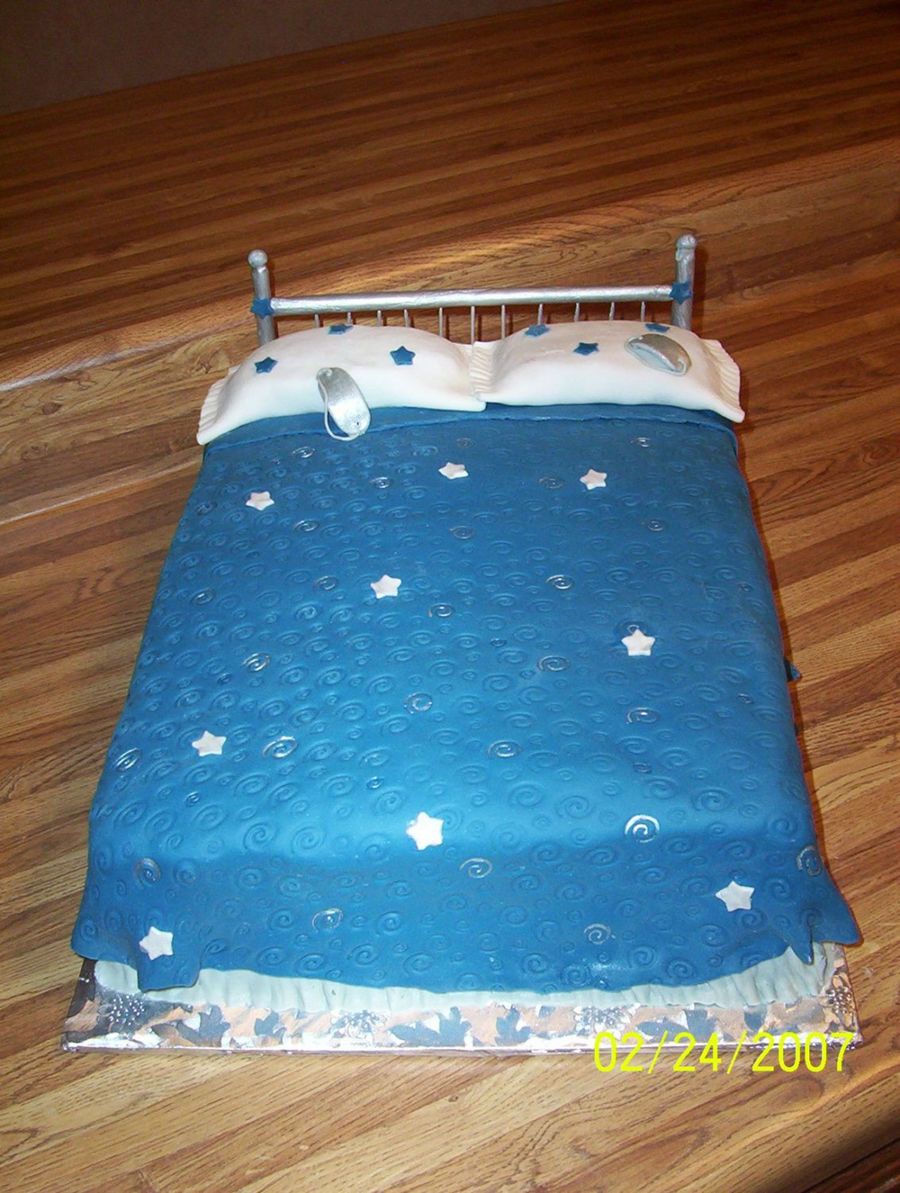 The is a bed cake covered with fondant and colored with silver dust. The bed frame is made from toothpicks and skewers covered with gumpaste.