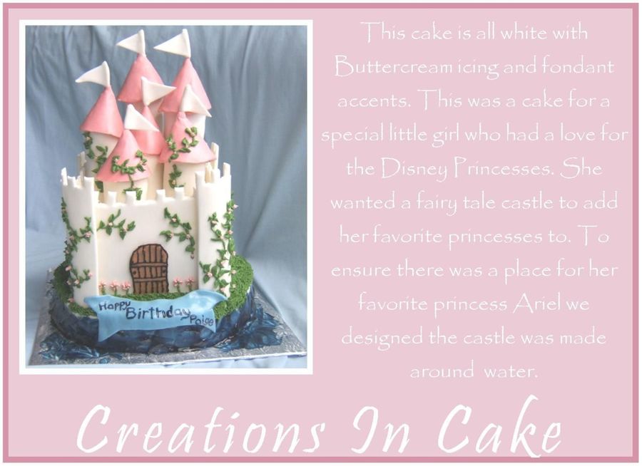 This is a white cake with white buttercream and fondant accents. It was later decorated with the disney princesses. Ariel was this little girls favorite princess that is why the castle had to be near the water.