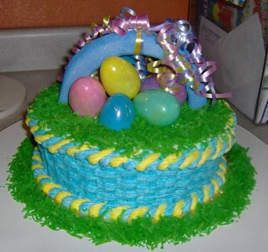 Butter cake, almond syrup and buttercream icing. Eggs are plastic and basket handle is colored foam.