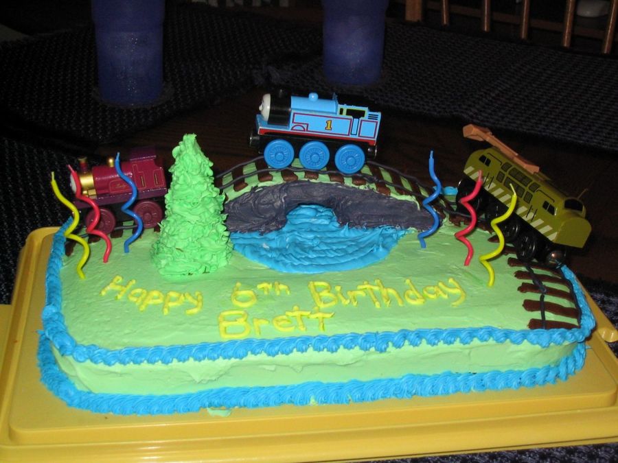 My son enjoyed his first Thomas cake so much that he's asked for a variation each year, He actually designed this one by telling me what he wanted it to look like. As usual there were a few boo boos but he enjoyed it. The bridge is actually part of his toy wooden train track wrapped up in saran and covered in the BC. Cake was made before I found CC as you can tell by the runny canned frosting!