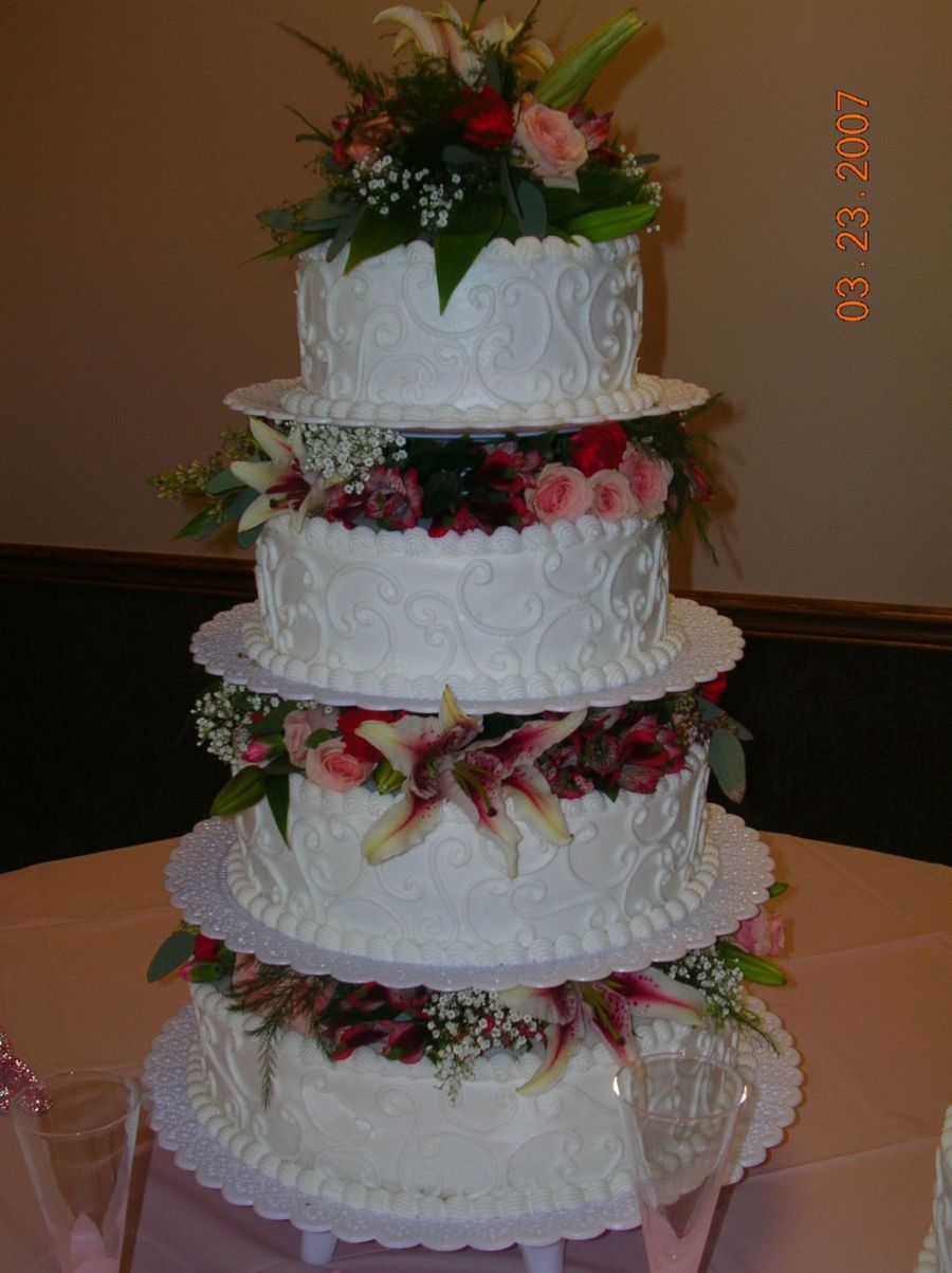 4 tiered round wedding cake iced with butter cream icing. Scroll work accents on the sides with shell borders. Sits on the tall tier cake stand. 8", 10", 12" and 14" rounds All flowers were fresh cluster roses, stargazer lilies, miniature lilies, button carnations and greenery filler.