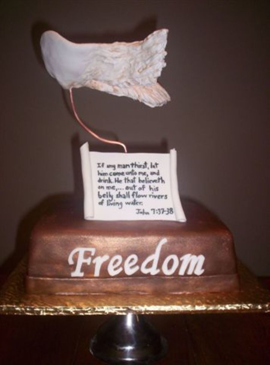 Cake made to look like sculpture (Freedom, Journey of Grace). Angel wings made with wire frame covered with MMF, painted with royal and then shadowed with cocoa powder.