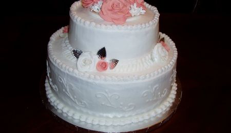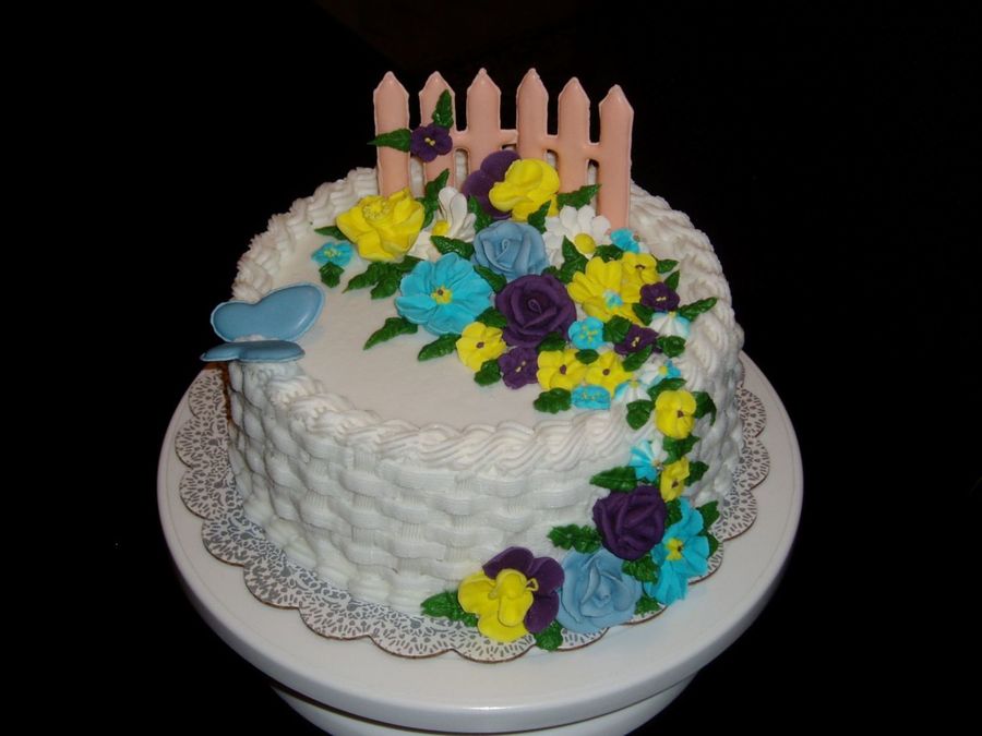 This cake was done in class. This was the last day when we put color flow patterns, basket weave technique and all the flowers from the course together in one cake.