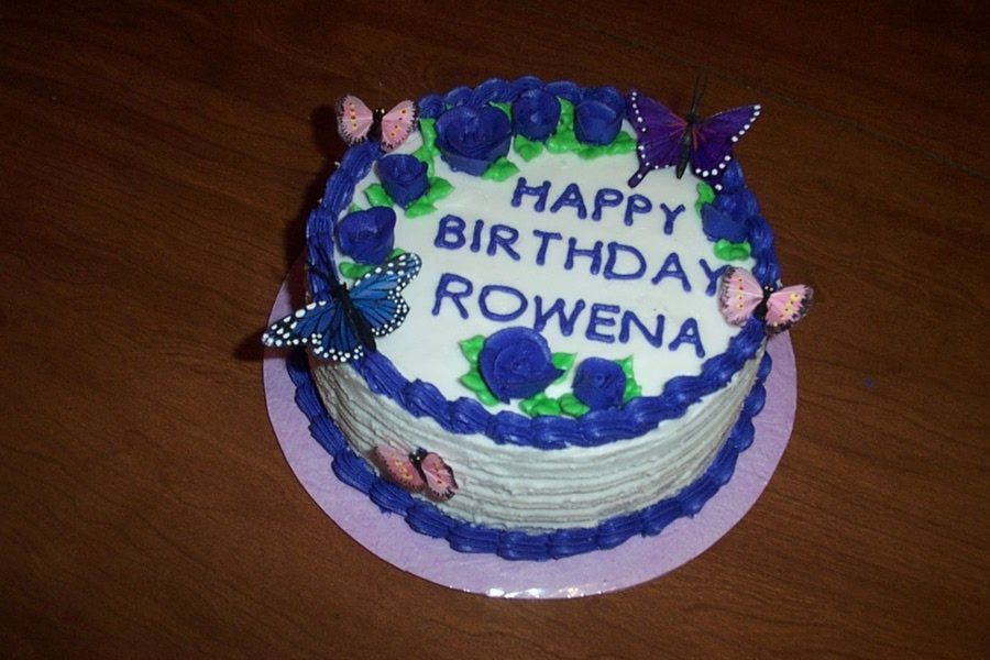 2 layer 8" chocolate cake made for a friend. originally had made chocolate butterflies, but they turned out horrible!!!!!!! so, used silk instead........ iced in bc. thanks for looking. :)