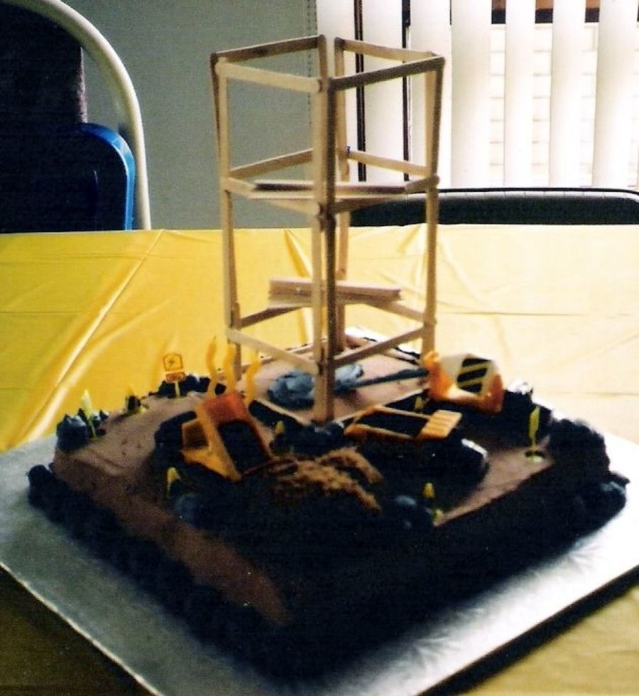 Slab cake using Brown Sugar for dirt hill and dollar store trucks and popsicle sticks to assemble building frame. Trucks came with little pilons and road signs.(used icing to keep building glued together)