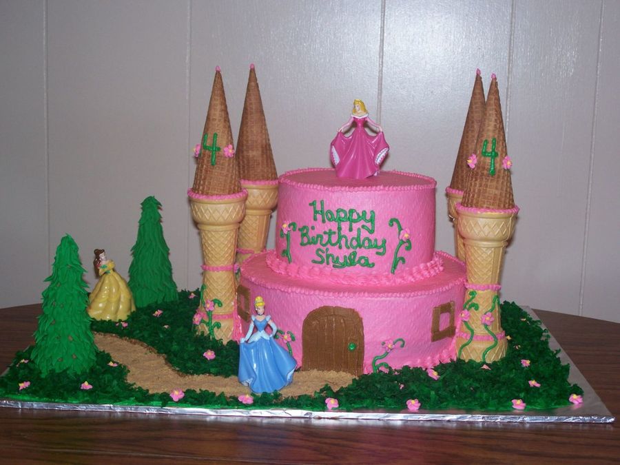 All white cake and Buttercream Icing. The pink flowers are Royal Icing. The Trees are sugar cones with royal leaves. The grass is coconut dyed green, and the path is graham cracker crumbs. The turrets are cake and sugar cones stacked with royal icing glue.