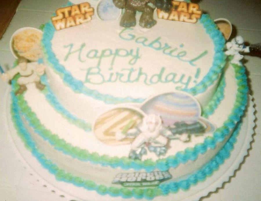 Star Wars with earth tone border. This was a last minute cake my niece needed for her son. I couldn't think of anything else so I used some of the toys she had bought for him. I also used the inserts and those little plastic planets. Everyone loved it especially her son.
