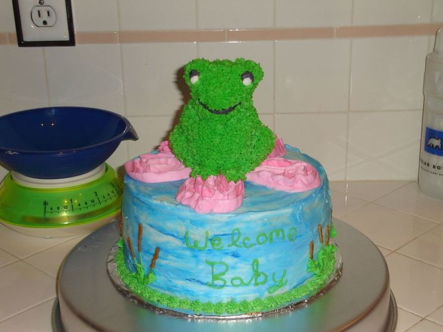 I made this cake for a baby shower where the mom-to-be loved frogs. I used the wilton mini-bear pan to make the frog. Cake is chocolate w/ Strawberry filling and buttercream frosting