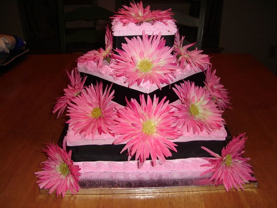 This cake was for a friends bridal shower. It was chocolate cake with raspberry filling and whipped icing. Detailed with black ribbon and pink gerber daisies.