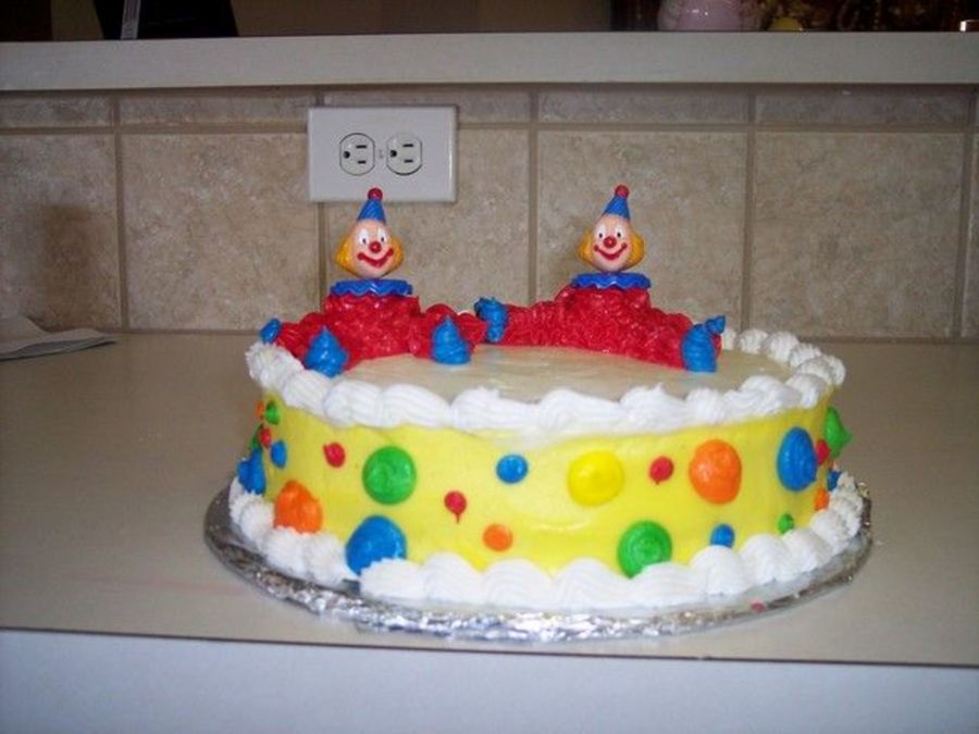 My 2nd cake for Wilton 1 class 3. I ran out of butter and had to use margarine for my BC-icing. So the icing didn't turn out very thick. You can tell the clowns and dots started to droop a little.
