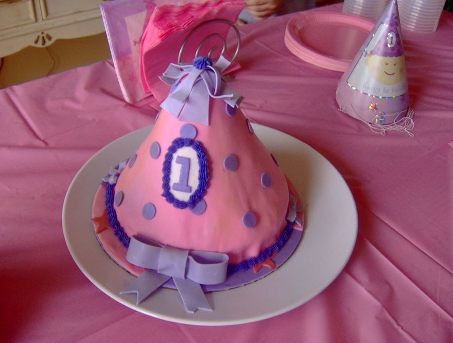 party hat birthday cake made to match napkins and plates. vanilla with strawberry cheese filling and BC and MMF on top.