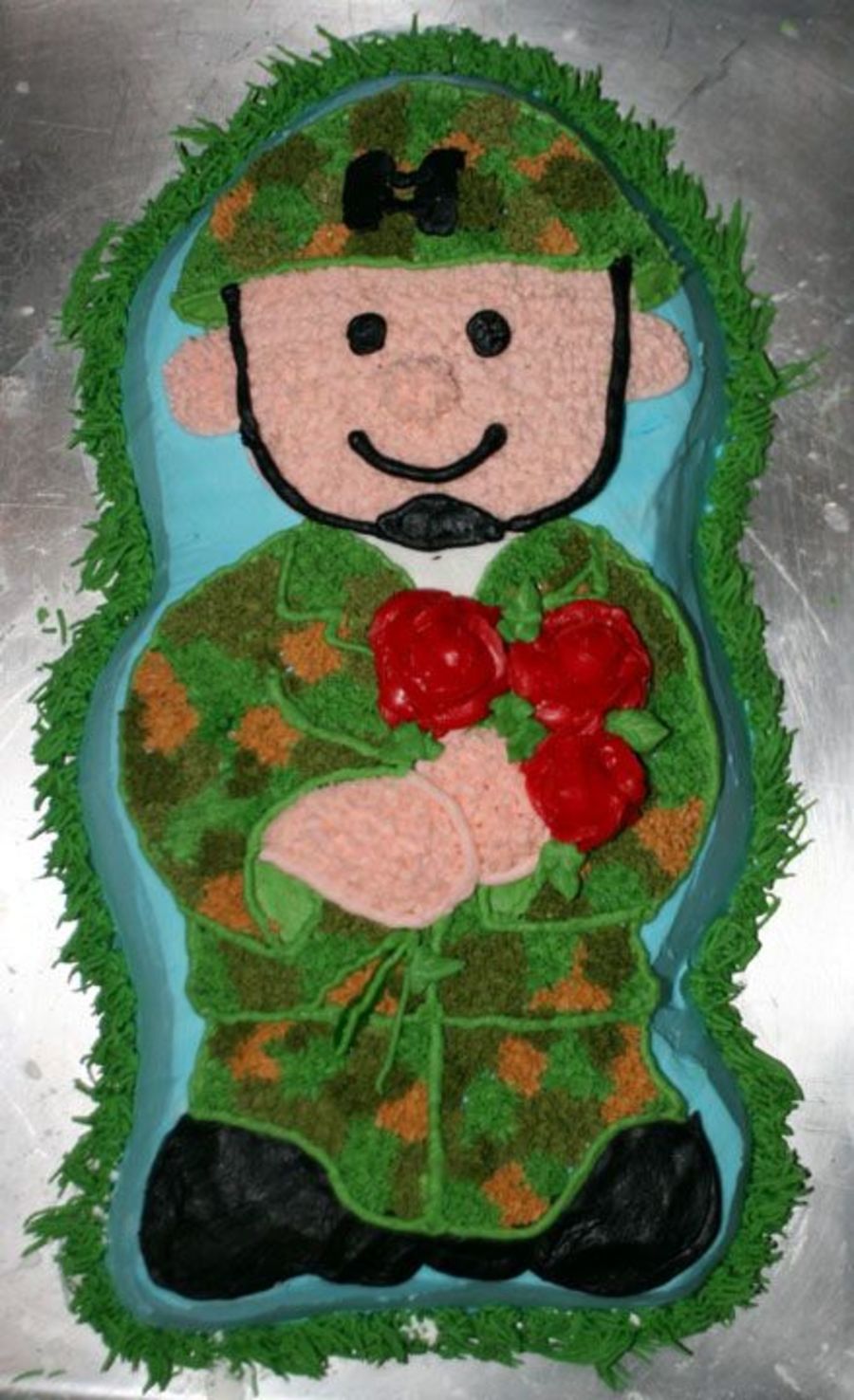 This cake was made for a friend of mine on her Birthday. Her husband is on his second year long rotation to Iraq. I figured since he couldn't be there for her birthday, I would "make" him be there. He is holding roses, her favorite flower. We even added his rank, captain, to the helmet. My friend, and her daughters, cried when they saw the cake, because it was as if he was there, is some way, to celebrate with them.