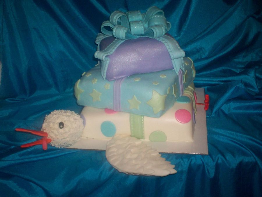 I saw this cake on cc that had a smased storked and Ive alwasy wanted to do it because i thought it was so funny. the cake part is different as the other was a whimsical style ...i thought that gifts would be better for the occasion. these are mmf fondant covered with a fondant bow. the head was a popcornball cover in fondant. it was for a boy so i tried to use more boyish colors but still wanted it to be colorful....after i took the picture i decided to make a fondant package tag that read special delivery