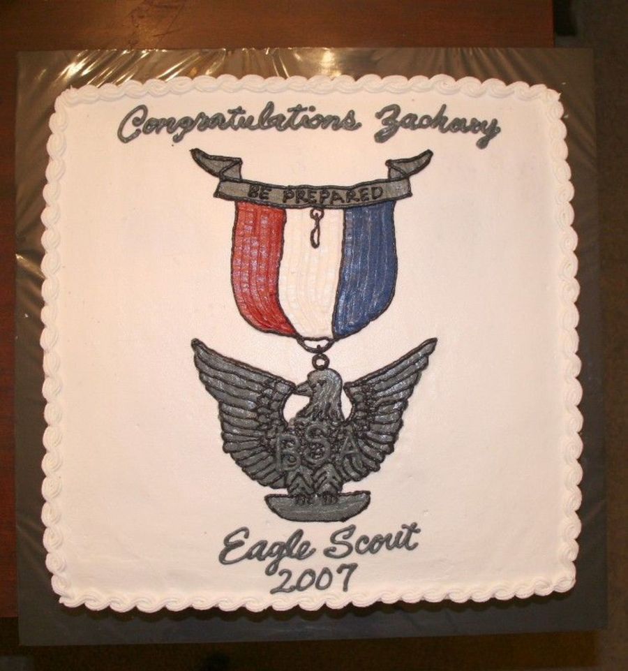 16" double layer chocolate/yellow cake All buttercream. Decorated to look like the Eagle scout medal.