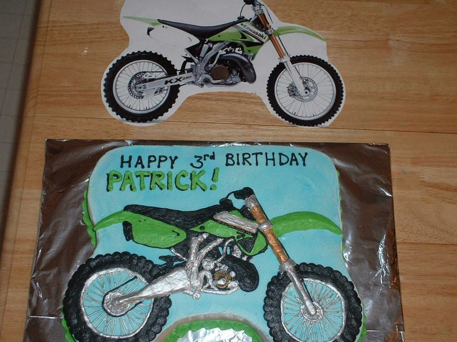 Used airbrush for blue background, piped buttercream for details, and painted over crusted buttercream with luster dusts for the chrome. Bike is cut out of 11x15 sheet.
