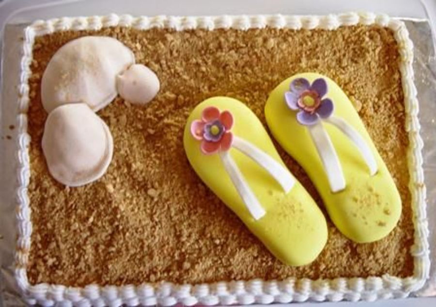 This cake was a lot of fun to do. white cake covered in buttercream. Sea shells. Flip flops are also cake covered in buttercream and MMF. I used a graham crackers for the sand. All other decorations are MMF.