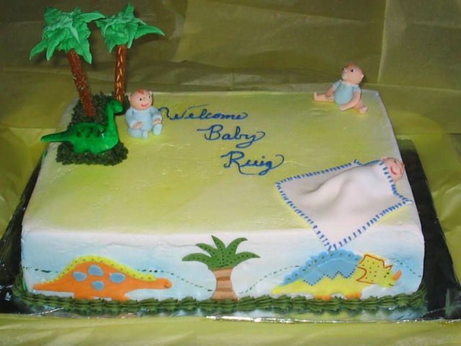 This is my first cake. The Palm trees are pretzel sticks with royal icing leaves. The babies and the dinosaurs are made from fondant. The cake is a yellow cake with strawberry and twinkie filling. The buttercream frosting is air brushed blue and yellow.