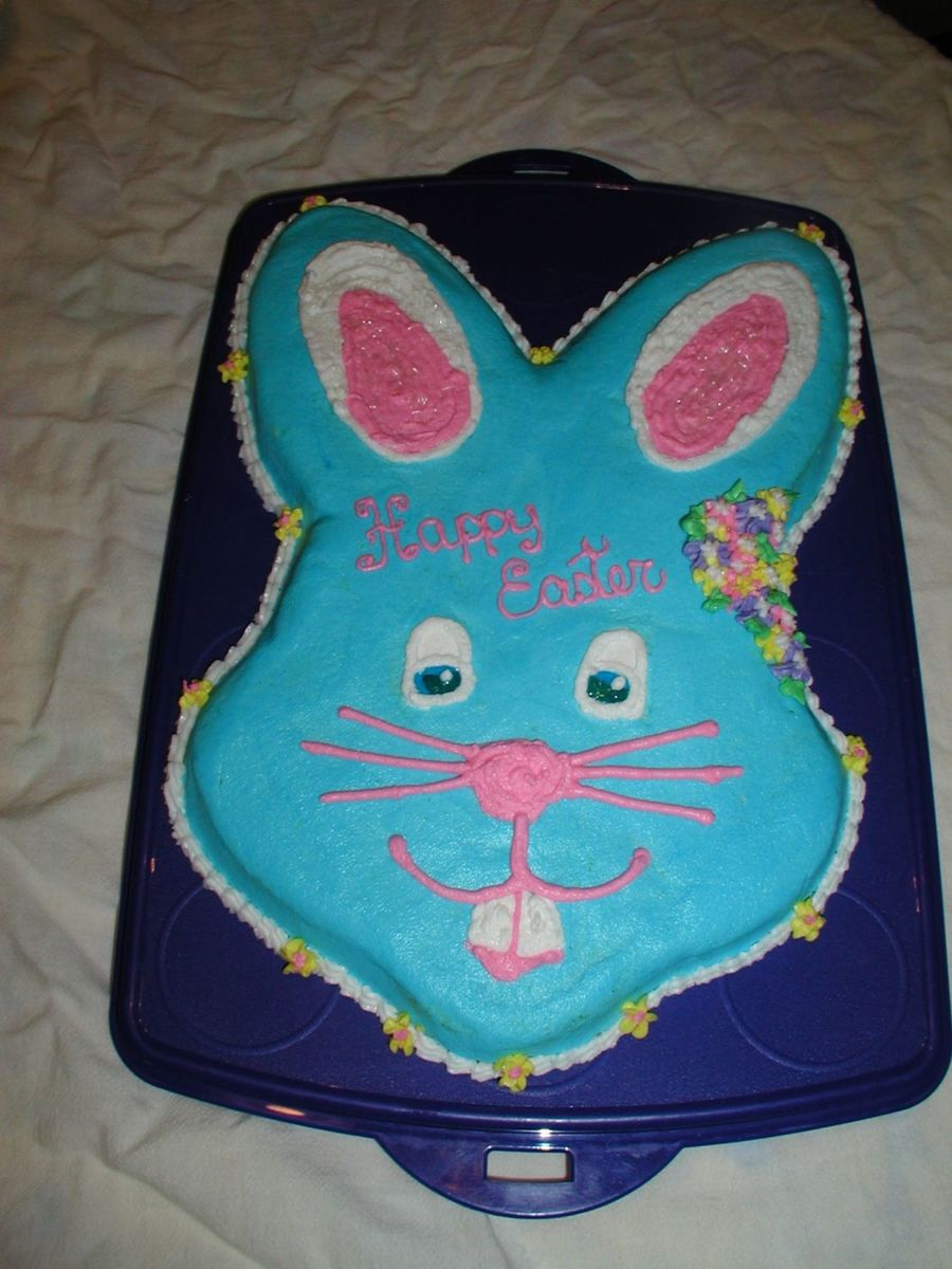 I made this cake in a bunny cookie pan so it's very flat for my son's daycare Easter Party, there are only 10 kids. The Boys wanted a blue Bunny, I just added a little color. It's all buttercream, I used a Viva towel and a 2" brush to flatten the BC on the cake, I think this is my favorite way to do it so far. I still have to try the roller method.