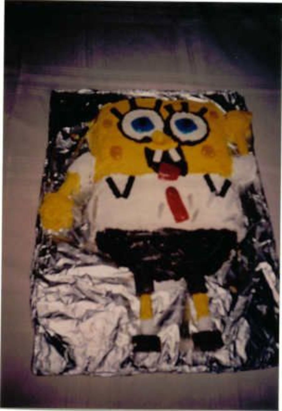 I made this for my moms bday. Its a yellow sheet cake, with licorice eyelashes, chicklet teeth, fruit by the foot tie, ho ho feet, pretzel rod for nose and legs, and sponge holes are smashed dots candies.